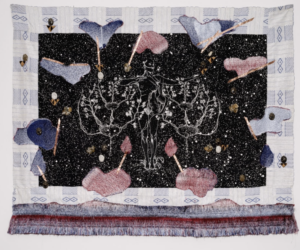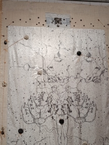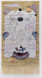 L’œuvre se construit sur une toile de fond tissée, à laquelle l’artiste ajoute un tissu servant de support à ses dessins. Sur cette surface, apparaissent des formes arborescentes qui évoquent des constellations, une sorte de cosmos, une voie lactée.