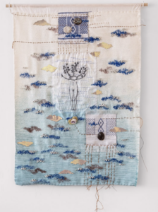 L’artiste privilégie le tissage artisanal à base de fibres naturelles (soie, coton), enrichi de broderies, dessins et ajouts de matériaux organiques tels que coquillages, écailles ou végétaux. Ces éléments confèrent à ses œuvres un relief qui dépasse la 2D et vont s’ouvrir progressivement vers « l’installation ».