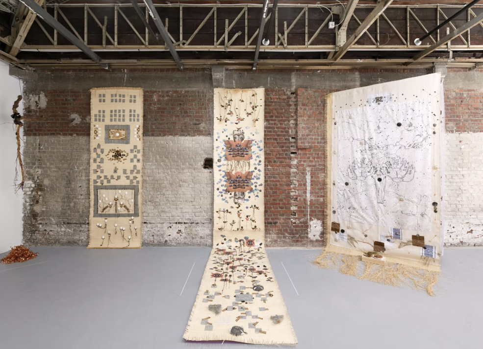 Ce choix n’est pas anodin. Il répond à une nécessité technique – permettre la suspension des éléments – mais il influence aussi la perception de l’œuvre. La structure crée un volume, une circulation, et introduit des espaces vides qui participent à la composition globale. Elle met en valeur les tapisseries tout en imposant une présence qui peut déranger.