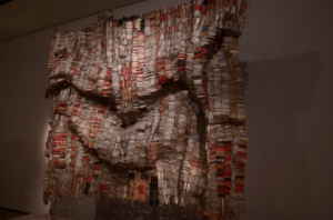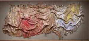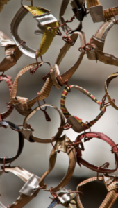 Marie-Claire Messoua revendique une influence de l’artiste El Anatsui. C’est un artiste Sénégalais reconnu pour son travail sur les matériaux de récupération. Il sublime des objets pauvres et prosaïques – capsules, canettes, métaux – pour créer des volumes.