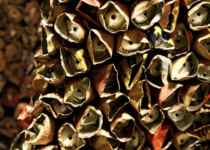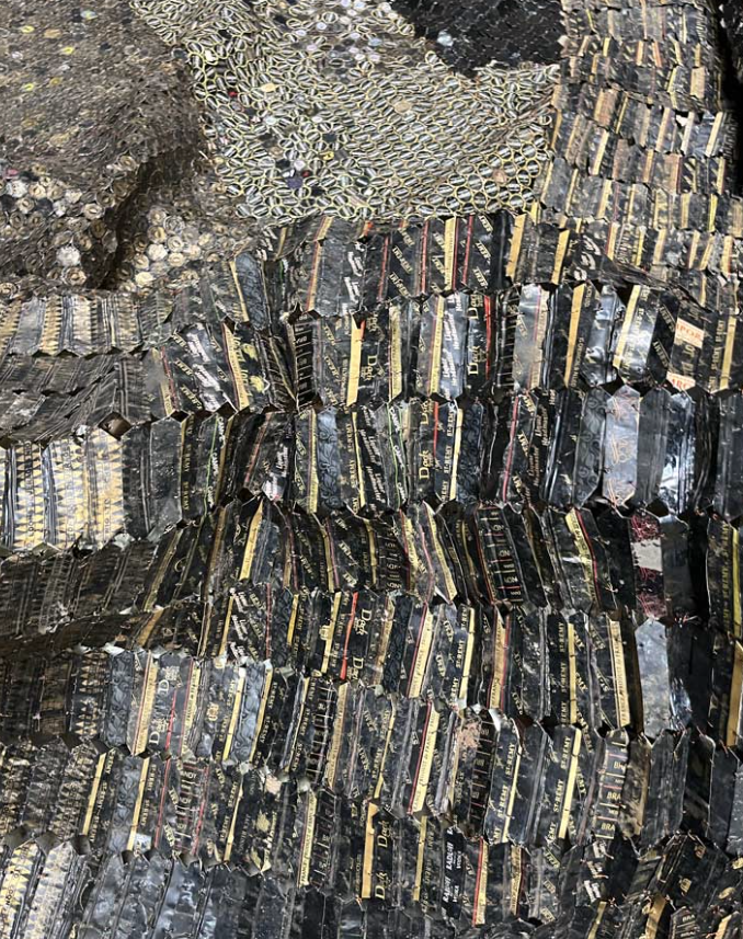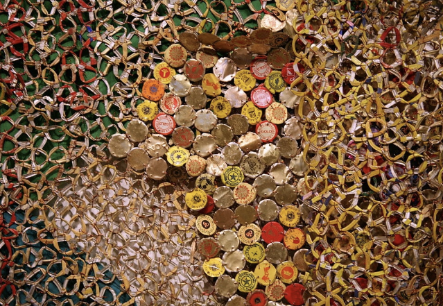 « J’ai observé le travail du plasticien El Anatsui qui m’a intéressé par les matériaux qu’il utilise pour créer ses volumes. Il transforme un matériau solide et rigide en un drapé d’apparence légère et voluptueuse. Les capsules d’aluminium façonnées, reliées par un fil de cuivre vont figurer des motifs ressemblants aux riches pagnes traditionnelles Akan ».