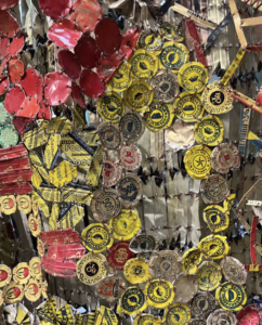 Le résultat, issu de rebuts, révèle une recherche esthétique affirmée : associations de couleurs, alternance de pleins et de vides, jeux de transparence. Certaines combinaisons évoquent une sensibilité occidentale, tandis que d’autres, plus bigarrées, rappellent les audaces chromatiques propres aux cultures africaines. Ce mélange confère à l’œuvre une identité singulière, entre deux univers esthétiques.