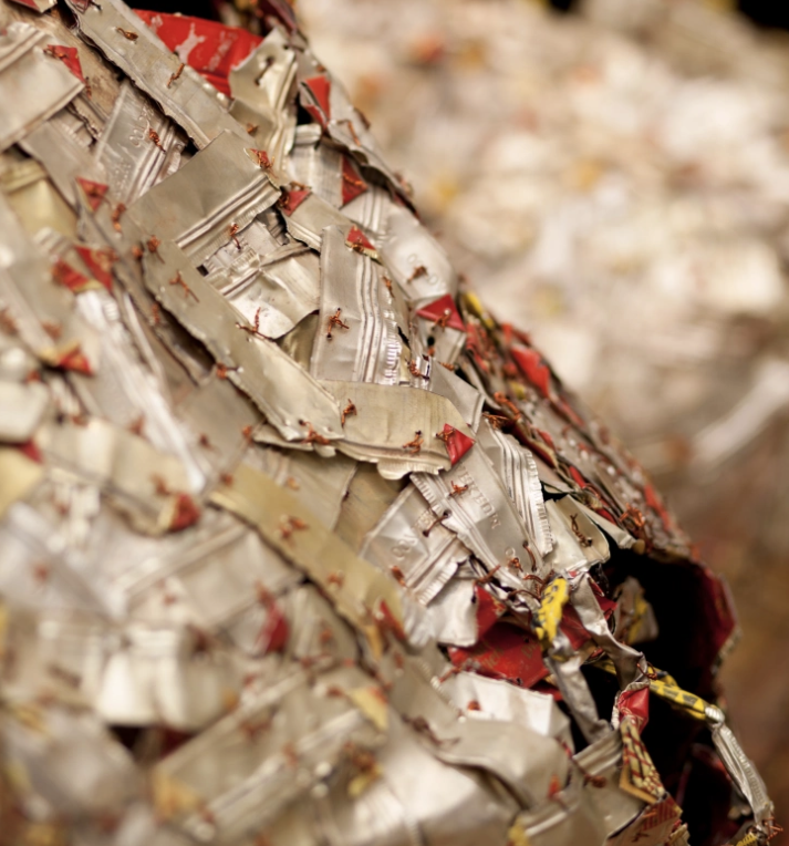 Le processus de création est complexe et collectif. L’artiste dirige aujourd’hui un atelier à Dakar où collaborent une cinquantaine de personnes. Les matériaux sont récoltés, triés par couleur, puis assemblés.