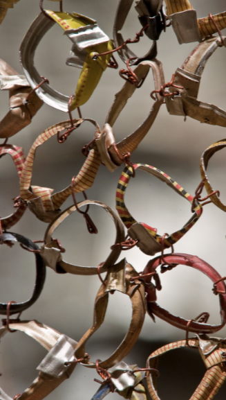 Chaque pièce est perforée et reliée par des fils de cuivre. Les capsules métalliques sont aplaties, parfois associées à des éléments circulaires, afin de créer des surfaces pleines ou ajourées.