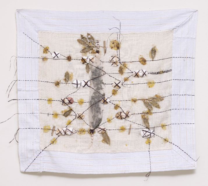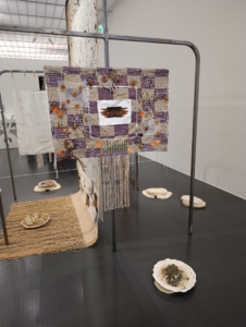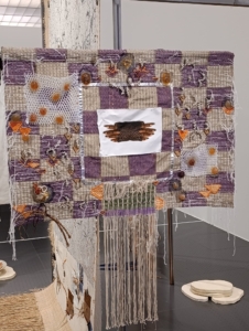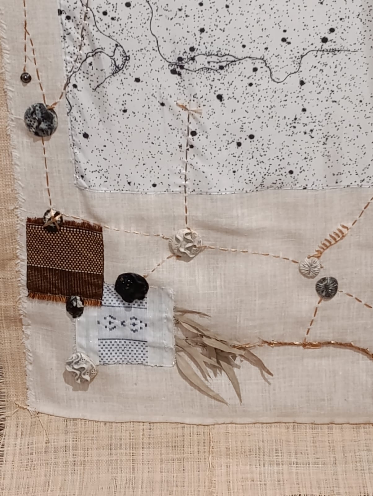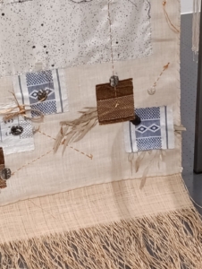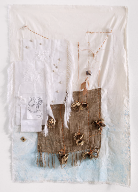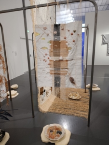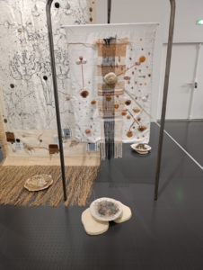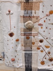 La pièce centrale se distingue par des fils qui s’étendent jusqu’au sol, où sont disposées des céramiques contenant coquillages et objets divers. Un tissu blanc est cousu à la base centrale, enrichi de tissages auxquels l’artiste ajoute des éléments reliés par des fils, ornés de boutons, coquillages et végétaux.