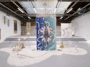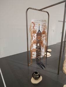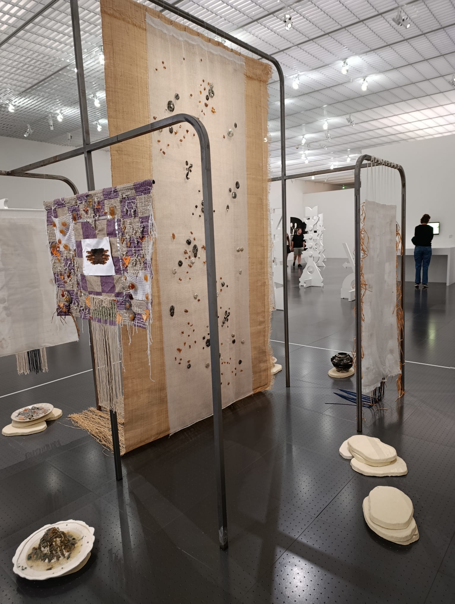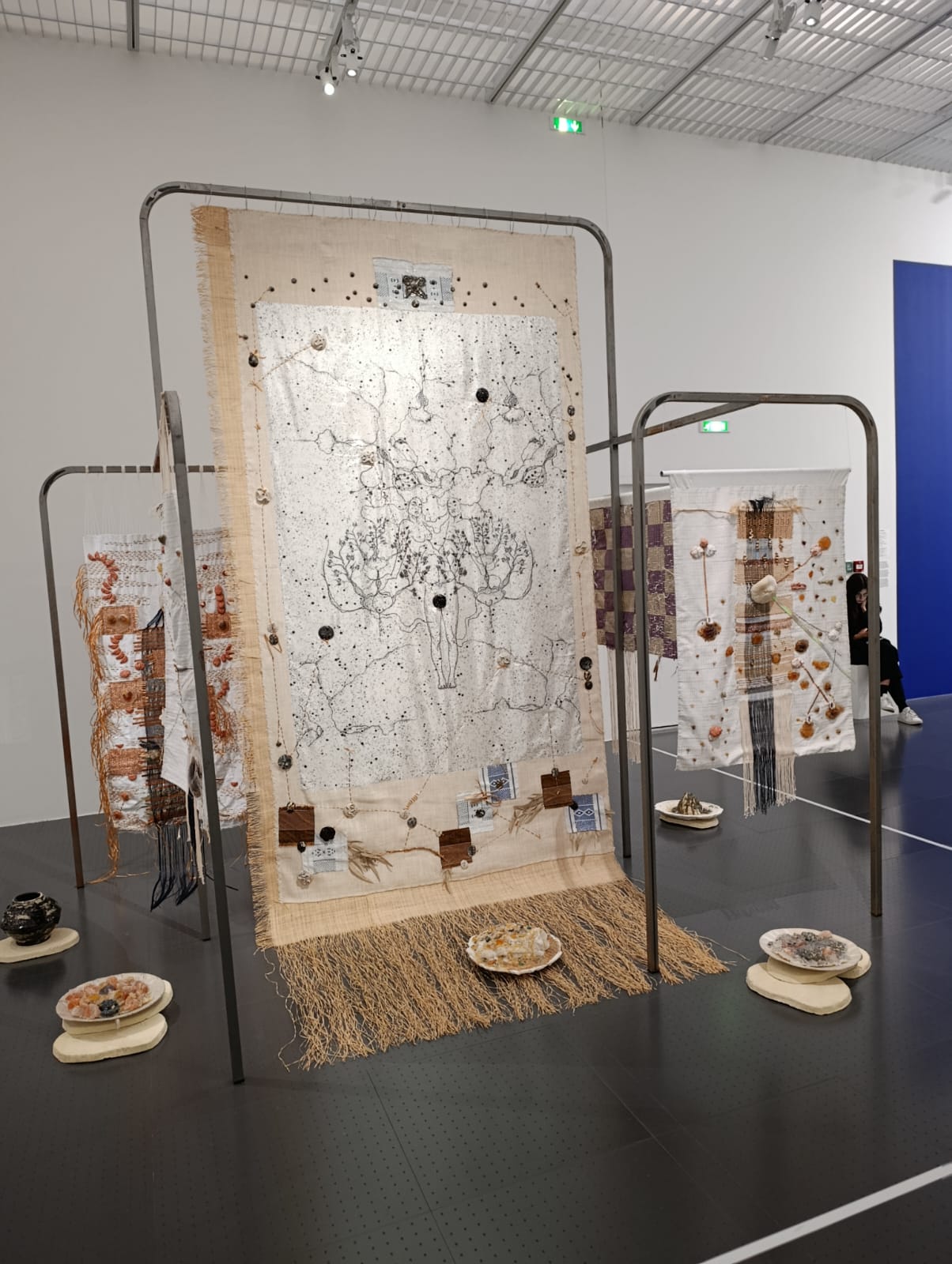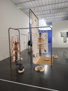 Certains éléments de l’installation peuvent surprendre, notamment la structure métallique qui soutient les tapisseries. Cette armature, froide et industrielle, semble en rupture avec le caractère mystique ou africain que l’on pourrait attendre de l’œuvre. Elle évoque plutôt la modernité occidentale : le métal, la rigidité, la neutralité des couleurs.
