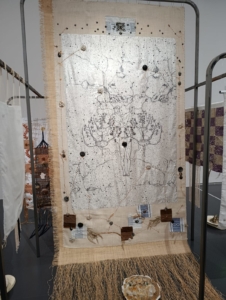 Cet aspect du » linceul », avec le tissu plus blanc, plus neutre, et cette dernière face située à l’arrière de l’œuvre, où sont disposés des éléments comme des pierres et des coquillages, évoque une forme de cosmologie, comme des fragments flottant dans l’univers. Cela traduit une difficulté à être entre la matérialité et le cosmique infini. Le sol noir renforce cette impression de contraste.