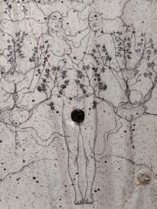 Sur le côté et au centre apparaissent des dessins de corps fragmentés, accompagnés de représentations d’organes indéterminés. Les fils dessinent des formes, reliant certains éléments et en laissant d’autres isolés.