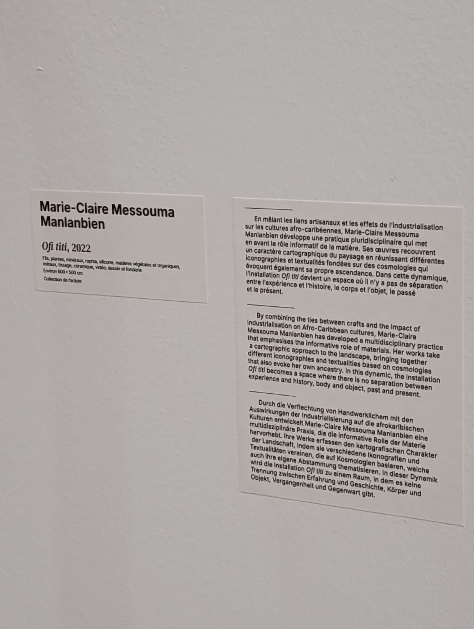 Marie-Claire Messouma Manlanbien est une artiste contemporaine née en 1990. Issue d’un père ivoirien et d’une mère guadeloupéenne, elle a grandi entre Abidjan et Paris, avant de se former à l’Académie des Beaux-Arts de Paris où elle vit et travaille actuellement.
