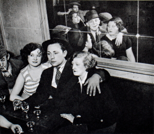 – Au niveau de l’axe de vision, au lieu d’être dans l’horizontalité et la frontalité on voit que Brassaï est debout et qu’il photographie des gens qui sont assis, et donc l’axe est en plongée.